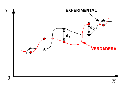 donde: d = distancia = Yobservada - Y obtenida por la ecuación Yobservada = Valor obtenido experimentalmente. Y obtenida por la ecuación = valor de la función evaluada en cualquier valor X Observando la gráfica, parece que esta distancia se puede usar para representar el error, pero habrá distancias positivas y negativas, (como se puede observar la distancia d1 es positiva y la distancia d2 es negativa) de modo que el error promedio para los puntos como los mostrados será pequeño aunque los errores individuales sean grandes. Esta dificultad podría ser resuelta usando el valor absoluto de las distancias, sin embargo al derivar la función del valor absoluto se generan ciertos problemas. La solución podría ser definir el error como el cuadrado de la distancia, esto elimina la dificultad del signo. Por esta razón el método se llama: Método de Mínimos Cuadrados.